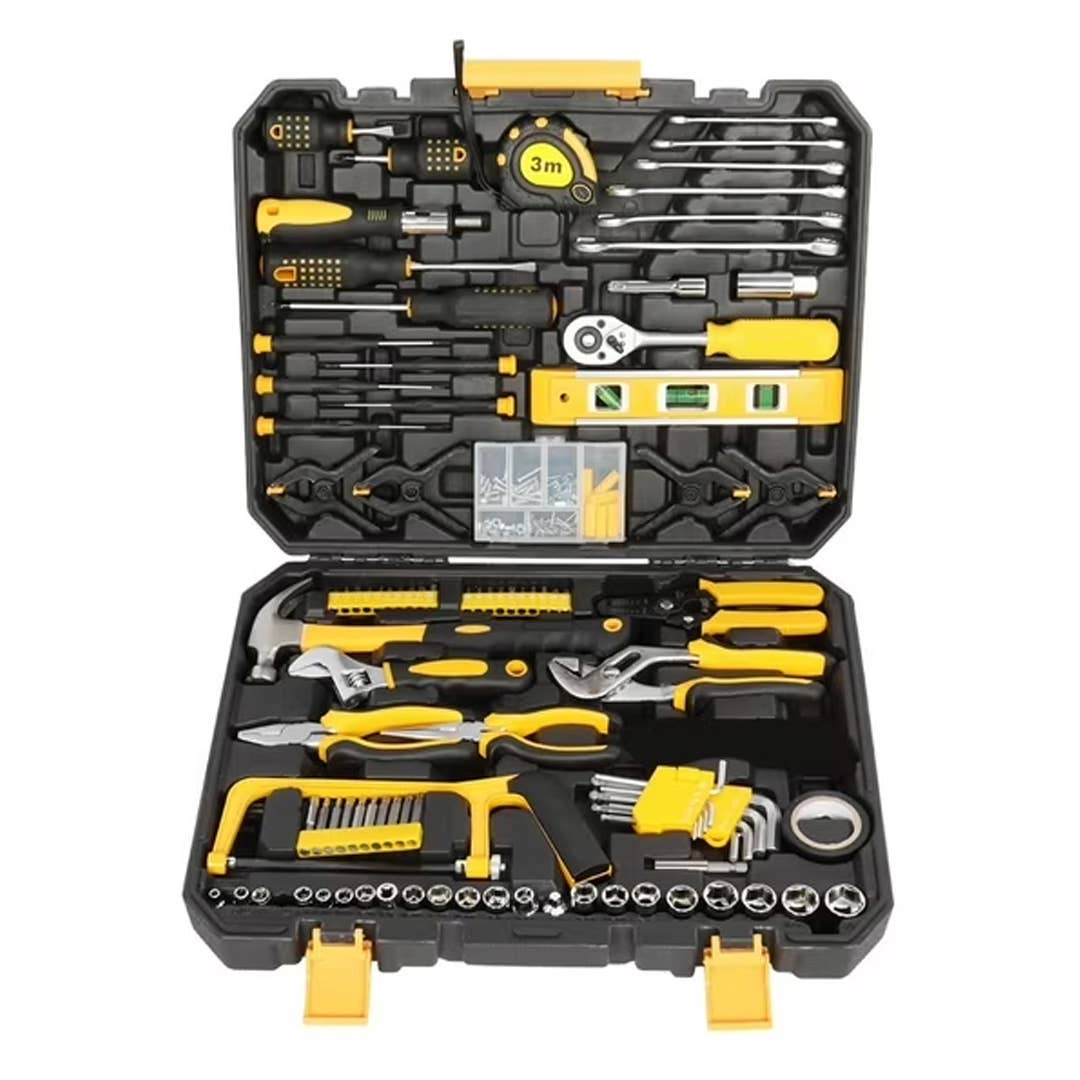 Available in yellow, this tool set has everything you might need to tackle various household tasks, as well as auto repairs and maintenance. It includes a hammer, an adjustable wrench, several types of pliers, a wire stripper, a utility knife, a saw, a complete screwdriver set, a quick-release ratchet with accompanying drive sockets, a tape measure, a level, and so much more. They all come packaged in a compact carrying case, making them convenient to carry and protecting them from moisture, dust, and general wear and tear.