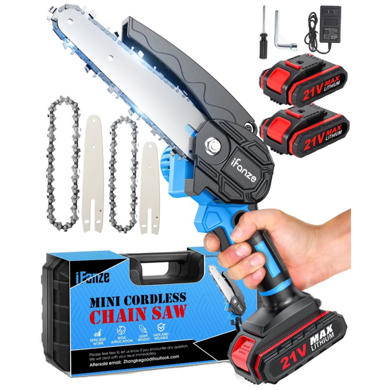 This mini saw promises to cut a log with a diameter of 6 inches in just 4 seconds thanks to its powerful lithium-ion battery and copper wire motor. It also only weighs around 5.5 pounds, making it a breeze to operate and carry around for adults of all ages. Perhaps the best part of this purchase, though, is what else it comes with. While many power tools often lack the thing that powers them, this cordless chainsaw includes two removable and rechargeable batteries as well as two interchangeable chains and a handy screwdriver just in case. All these add-ons allow you to get plenty of use out of this chainsaw, whether you’re pruning branches or cutting through small stumps in the backyard. And as for safety, this tool features a switch lock to prevent accidental activation and baffles to stop debris from coming back on you.