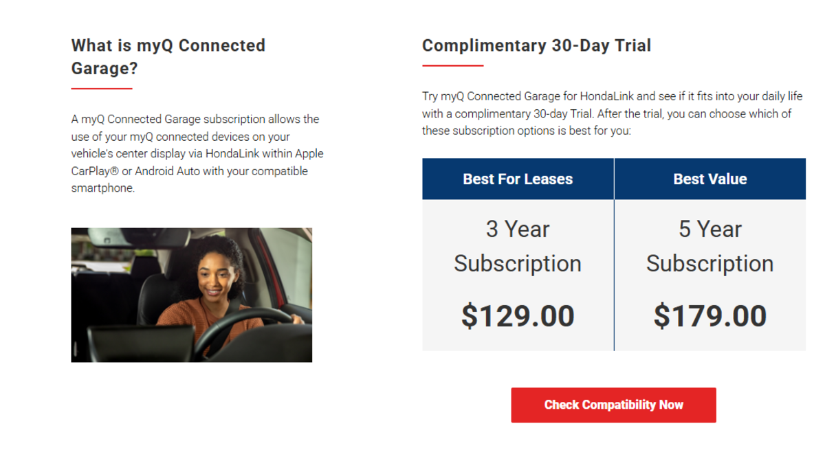 The good news is that you might not have to subscribe to Hondalink’s more advanced tiers. The integration in question is MyQ, a garage door opener app that runs on a subscription.
