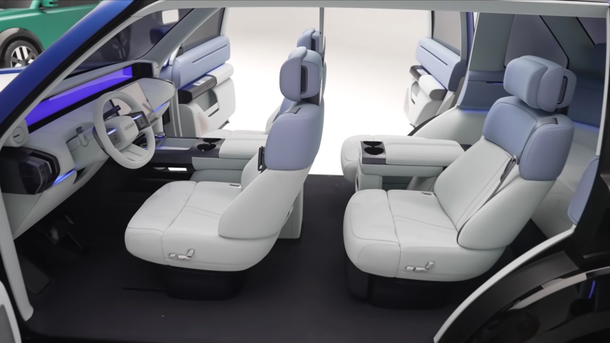 You’ve probably noticed that many features of this concept are just for show, such as the suicide doors, the displays instead of headlights, the rear window replaced by a folding fabric, and the unusual seating arrangement with a lounge-style third-row sofa instead of actual seats.