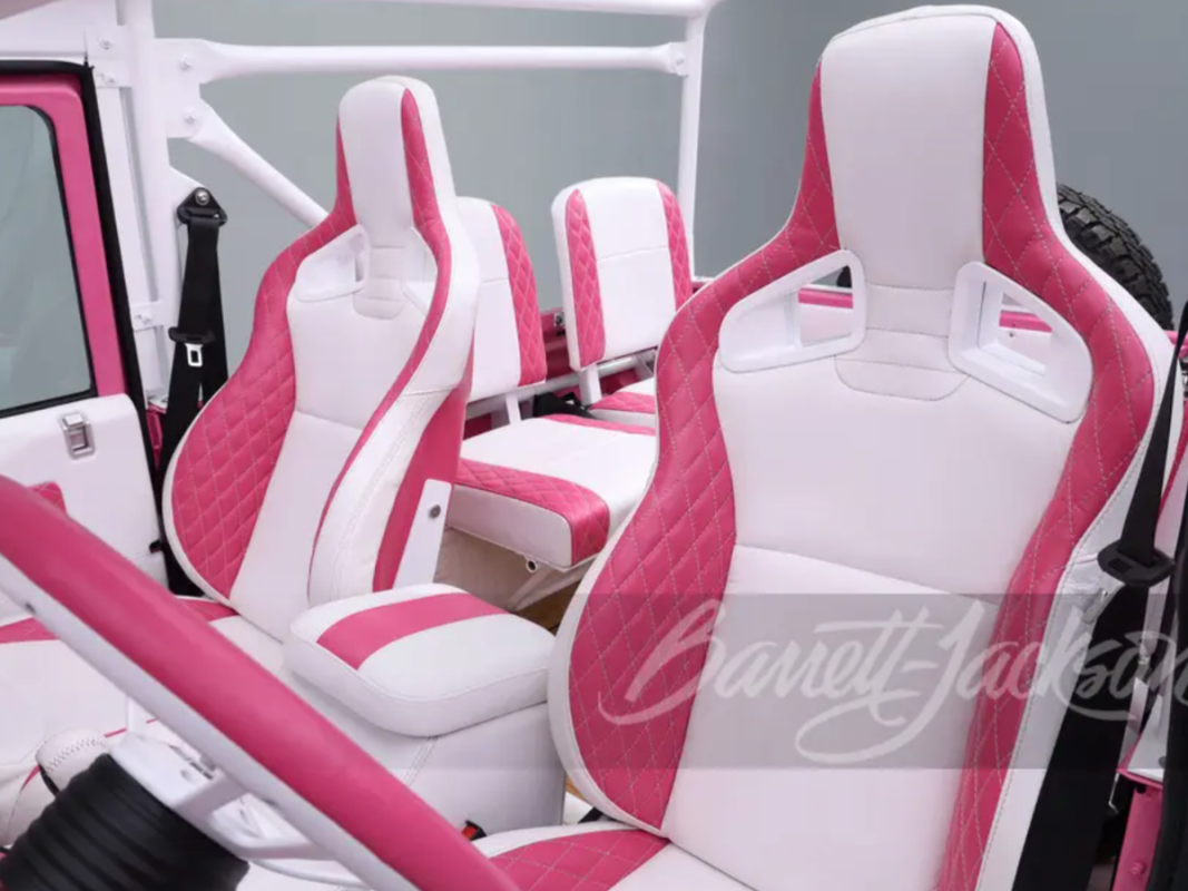 Visually, the build commits completely to its Barbie inspiration. The exterior is finished in a bold pink, paired with a soft-top configuration that leans into a beach cruiser persona. Custom wheels with pink and white accents reinforce the theme without looking like an afterthought. Inside, the cabin is retrimmed in pink and white leather with hand-stitched detailing. A touchscreen infotainment system with Bluetooth and Apple CarPlay adds modern usability. This is not just a showpiece. It is a usable, one-of-one statement.