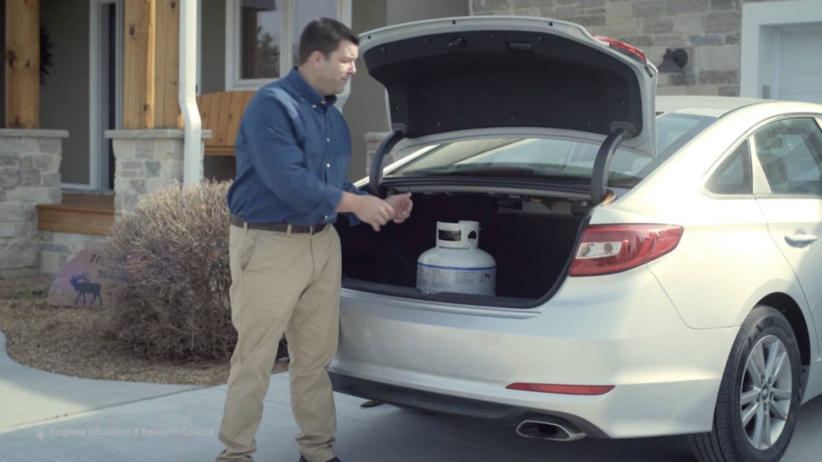 Propane is commonly used as a fuel for heating and grills, but it is extremely flammable and needs to be handled with great care. Propane provide AmeriGas recommends carrying a propane tank wedged tightly between the front seat and the back seat in a vehicle, always in an upright position and firmly secured. If you transport it in the trunk, you’ll need to support it so that it stays upright during the drive.