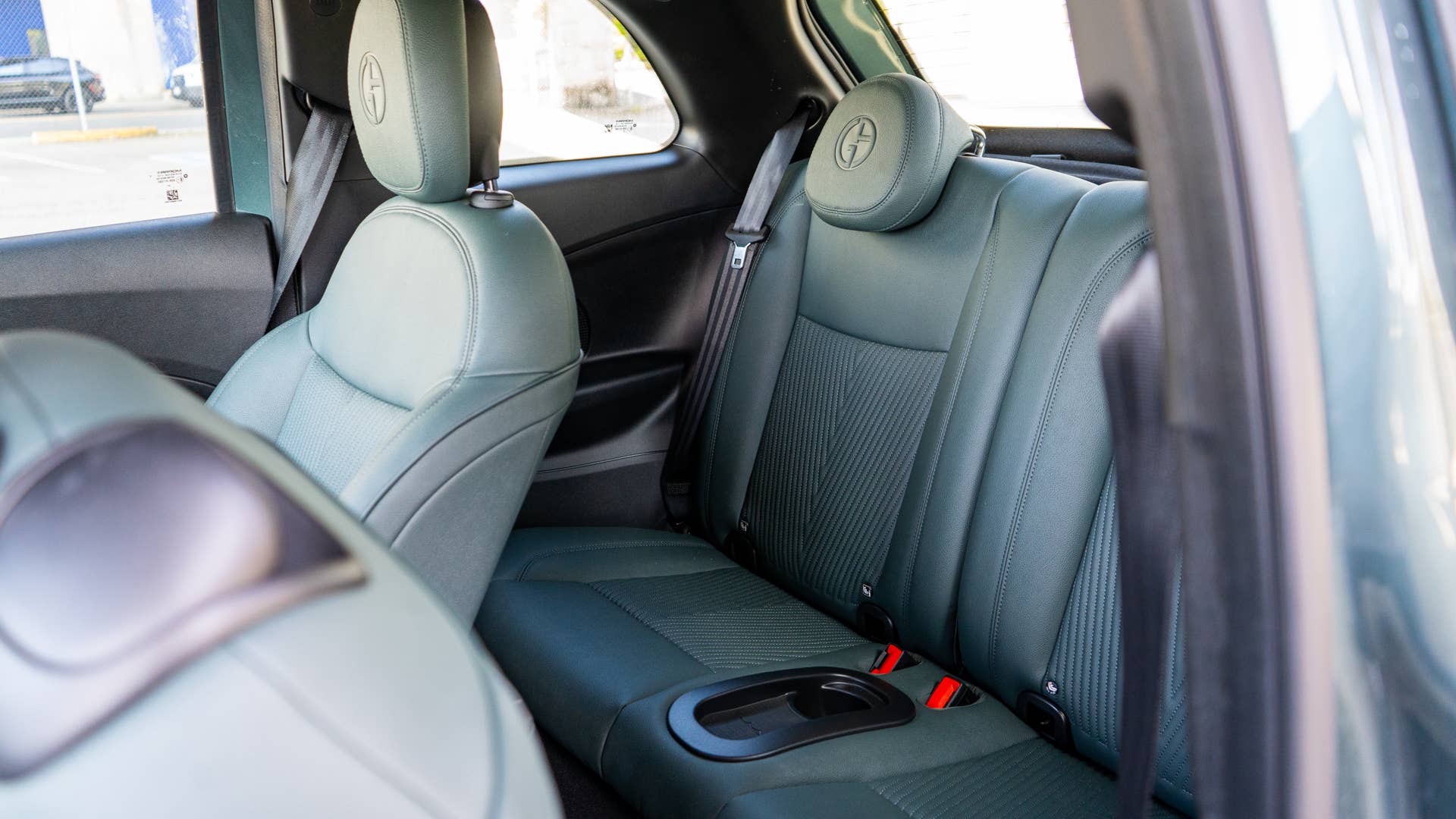 Inside, the Armani treatment continues with tasteful restraint. Eco-leather-faced seats, Armani fabric accents, emblem-embossed headrests, wood-look trim, branded seat belts, and small signature details elevate what could otherwise be an ordinary subcompact cabin. The front seats were comfortable over longer drives, and heated seats worked well once the laggy interface cooperated. What surprised me most, however, was the space in the rear. No one expects generosity from a Fiat 500e, yet its upright proportions deliver better packaging than the exterior suggests. Rear-seat accommodations remain tight, naturally, but adults can survive short urban trips without being hunched. Compared with some coupes and sports cars at this price point, there is actual headroom back there.