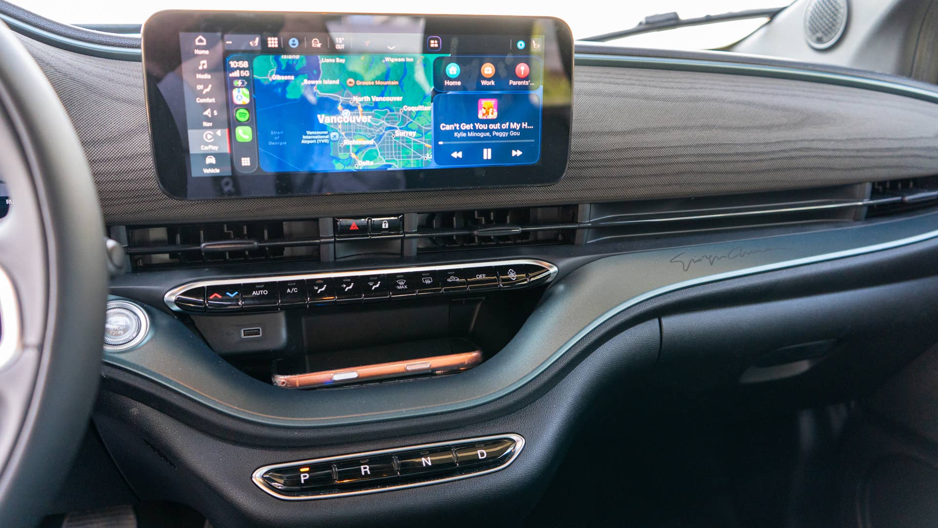 The 500e comes standard with a 10.25-inch Uconnect 5 touchscreen, navigation, wireless charging, a rear-view camera, and a 7-inch digital instrument display. That sounds promising, but in practice, the results were somewhat mixed. Once loaded, the system is perfectly usable. Wireless Apple CarPlay worked reliably during my test, and the backup camera was sharp and clear. The available seven-speaker amplified audio system with a subwoofer in this Armani Edition was also better than expected, delivering enough richness to carry my R&B playlist out of open windows and onto the crowded streets of Downtown Vancouver.